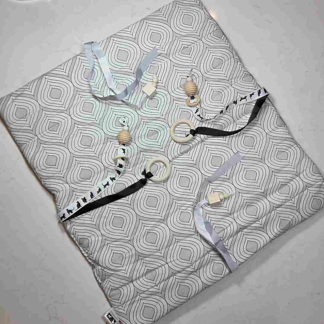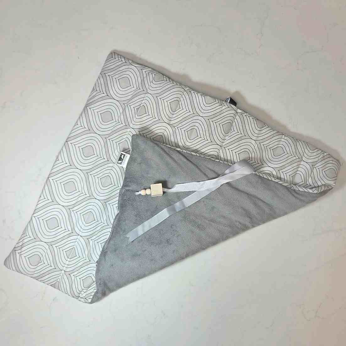 - Made from 100% cotton fabric (white, black and grey geometric) on one side and super soft 100% polyester grey, minky fabric on the other