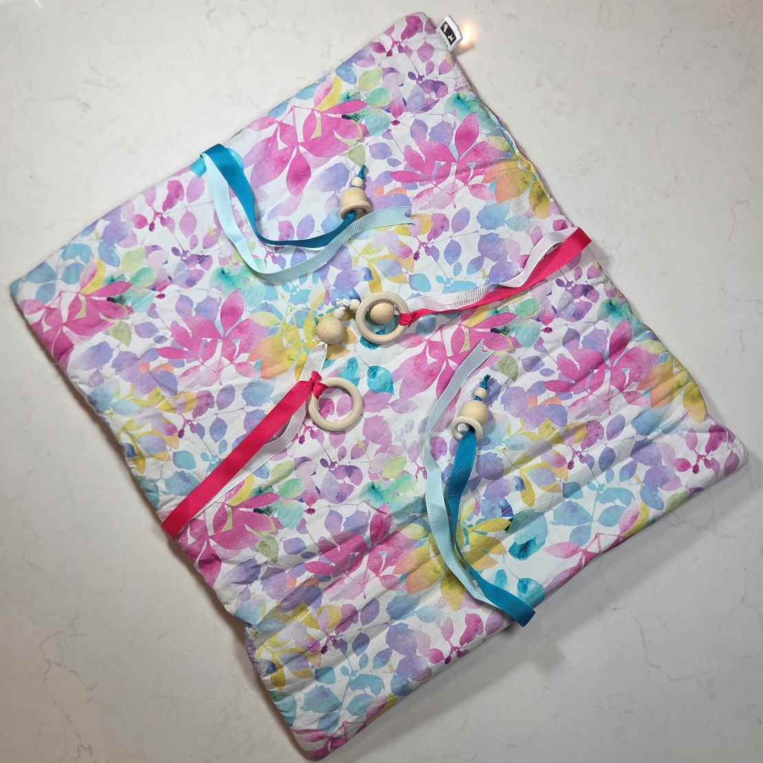 - 8 play ribbons with natural wood beads and rings securely attached