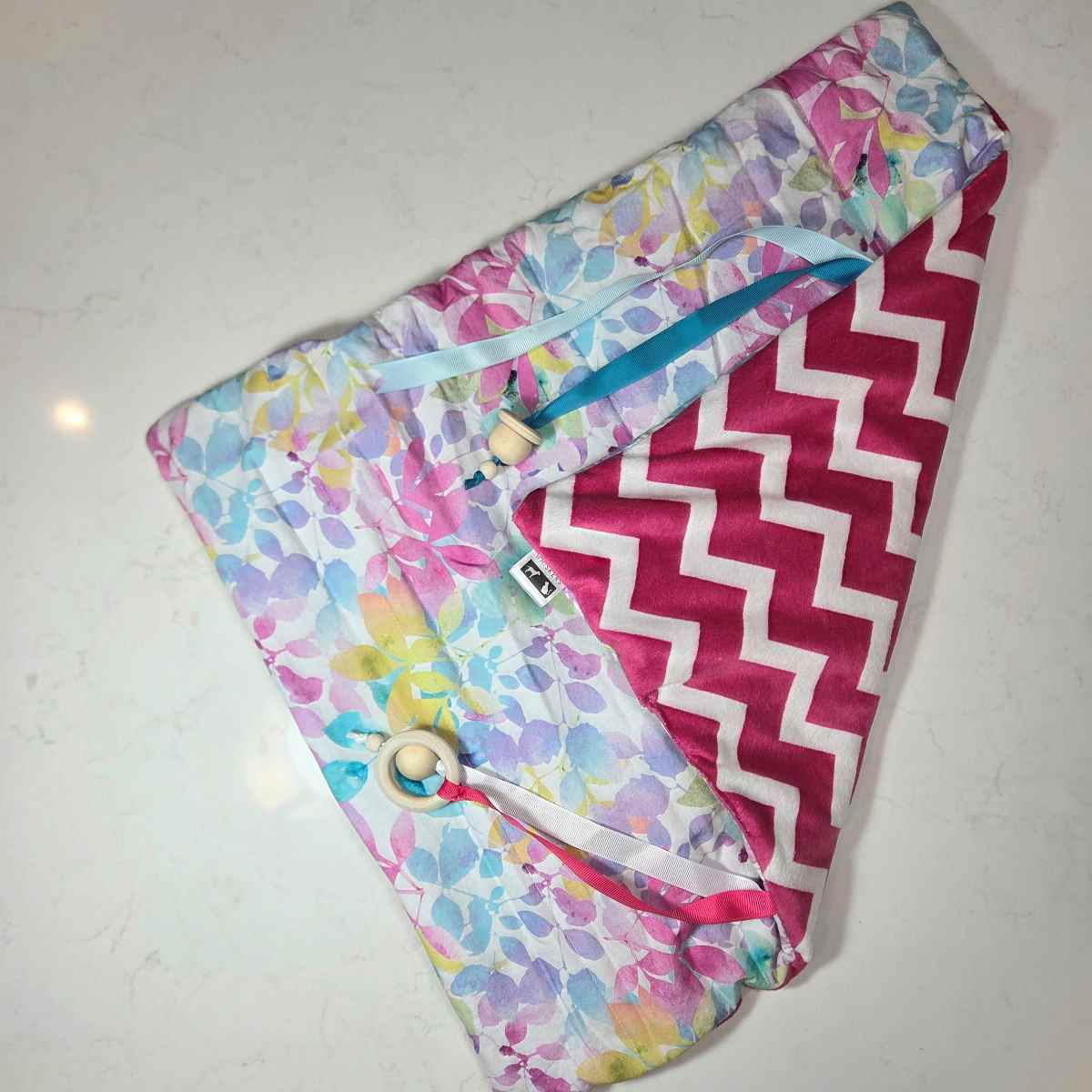 - Made from 100% cotton (multi coloured floral print on white background) on one side and super soft 100% polyester, white and pink, minky fabric on the other
