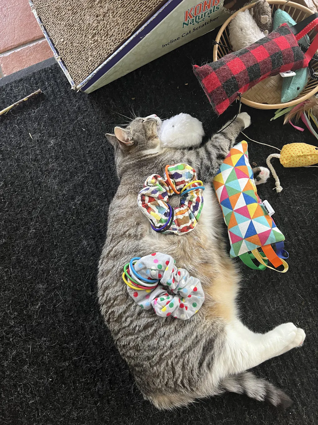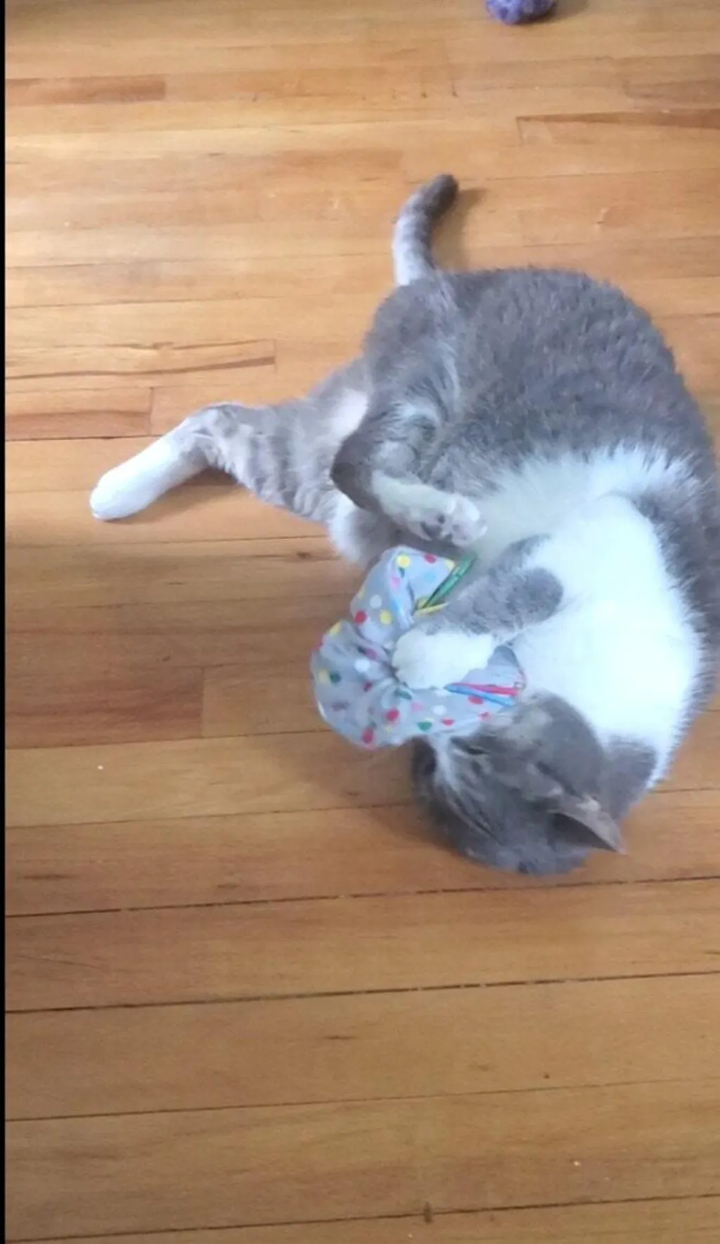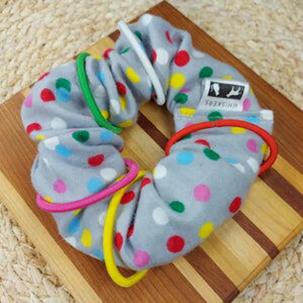 Most cat moms know that tops on their cat's list of forbidden items to play with, are hair scrunchies and any sort of elastic they can get their paws on. Elastics are tons of fun, they are springy, stretchy, jumpy and lively, but regular elastics can be dangerous for cats. The Catnip Scrunchie Cat Toy is a safe alternative and loads of fun !